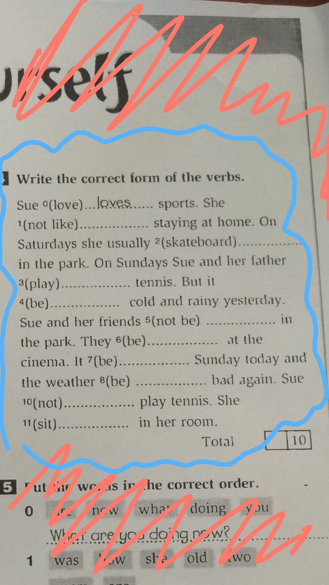 Sue loves sports.She doesnt like staying at home.On Saturdays she ussualy skateboarding at the park.On sundays Sue and her father plating tennis.But it was cold and rainy yesterday.Sue and her friends not hanging out in the park.They being at the cinema.It was Sunday today and the weather beaing bad again.Sue doesnt play tennis.She sits in her room.