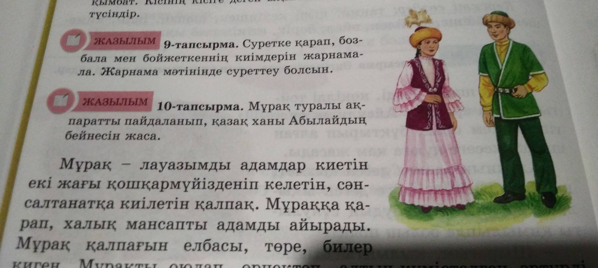 қыздың көйлегі қызғылт түсті, сыртында қызыл камзолы бар, басында үкілі сәукелесі бар, киімі қазақы оюлармен өрнектелген