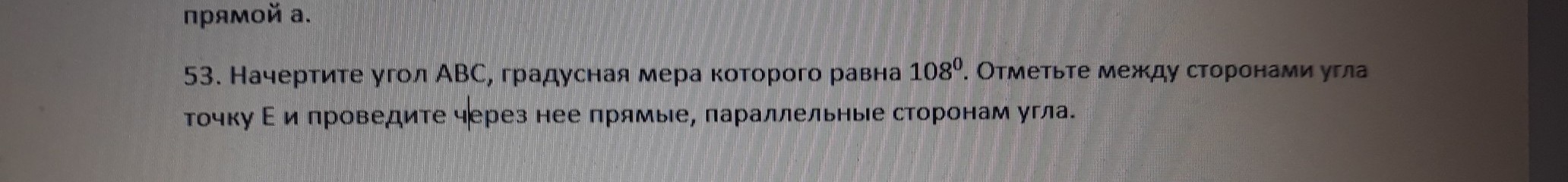 Транспортиром строишь угол в 108°, думаю это объяснять не надо) Внутри угла ставь точку, назови ее Е и проведи через эту точку линии, которые будут параллельны со сторонами угла (линии из которых состоит угол)