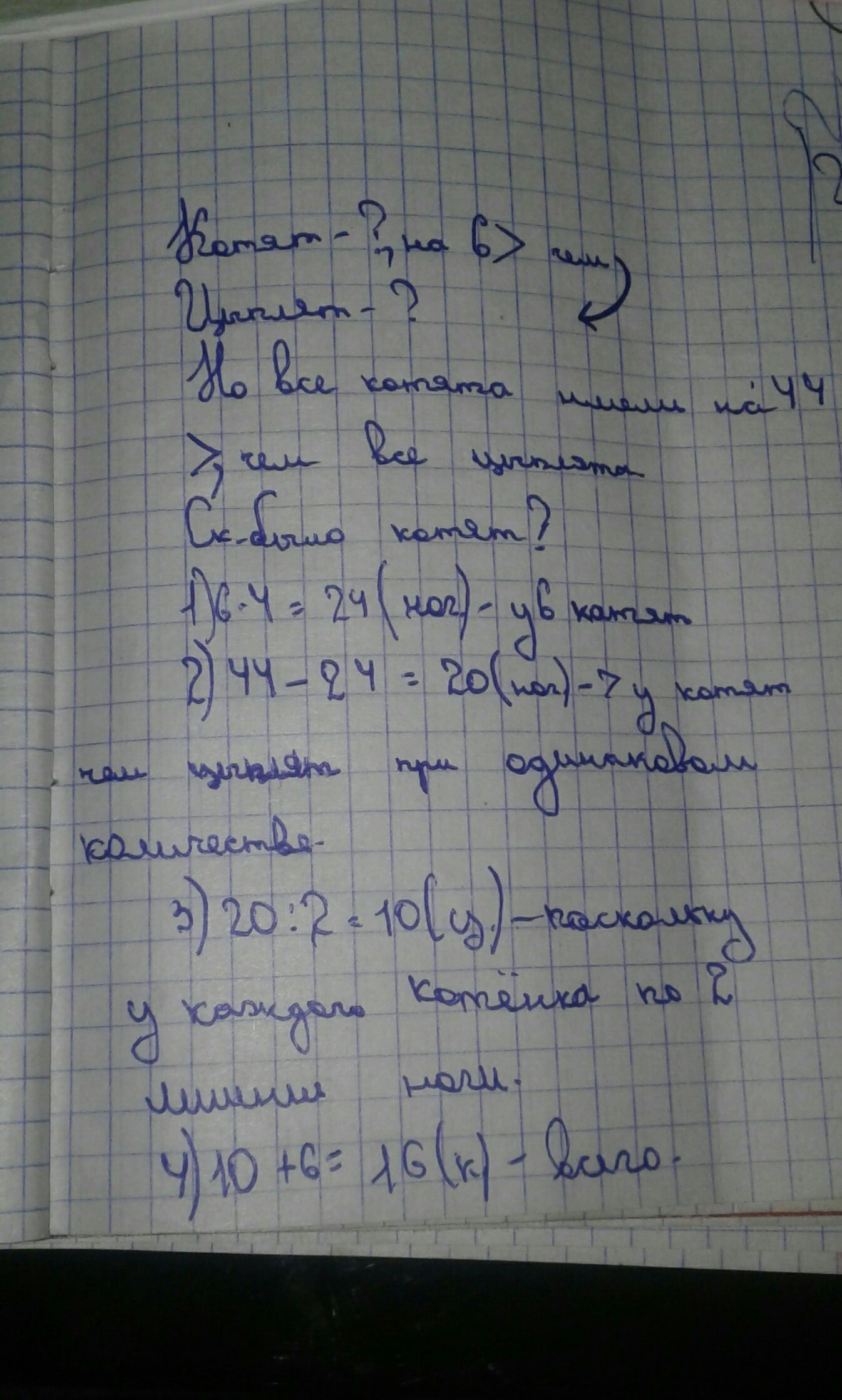 Котят было на 6 больше, чем цыплят,а ног все котята имели на 44 больше,чем все цыплята.Сколько было котят?
