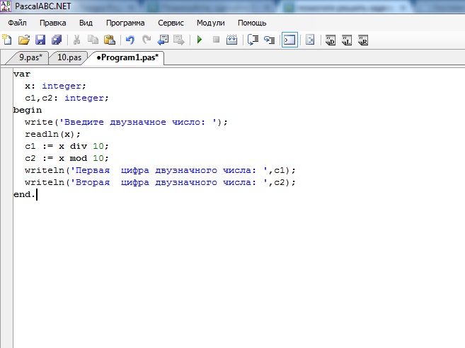 2.дано двузначное число. вывести вначале его левую цифру(десятки),а затем-его правую цифру(единицы). для нахождения десятков использовать операцию деления нацело,для нахождения единиц-операцию взятия остатка от деления.