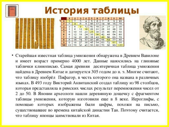 Старейшая десятеричная таблица умножения найдена в ДревнемКитае и датируется 305 годом до н. э. Иногда изобретение таблицы умножения приписывают Пифагору, в честь которого она названа в различных языках, включая французский, итальянский и русский.