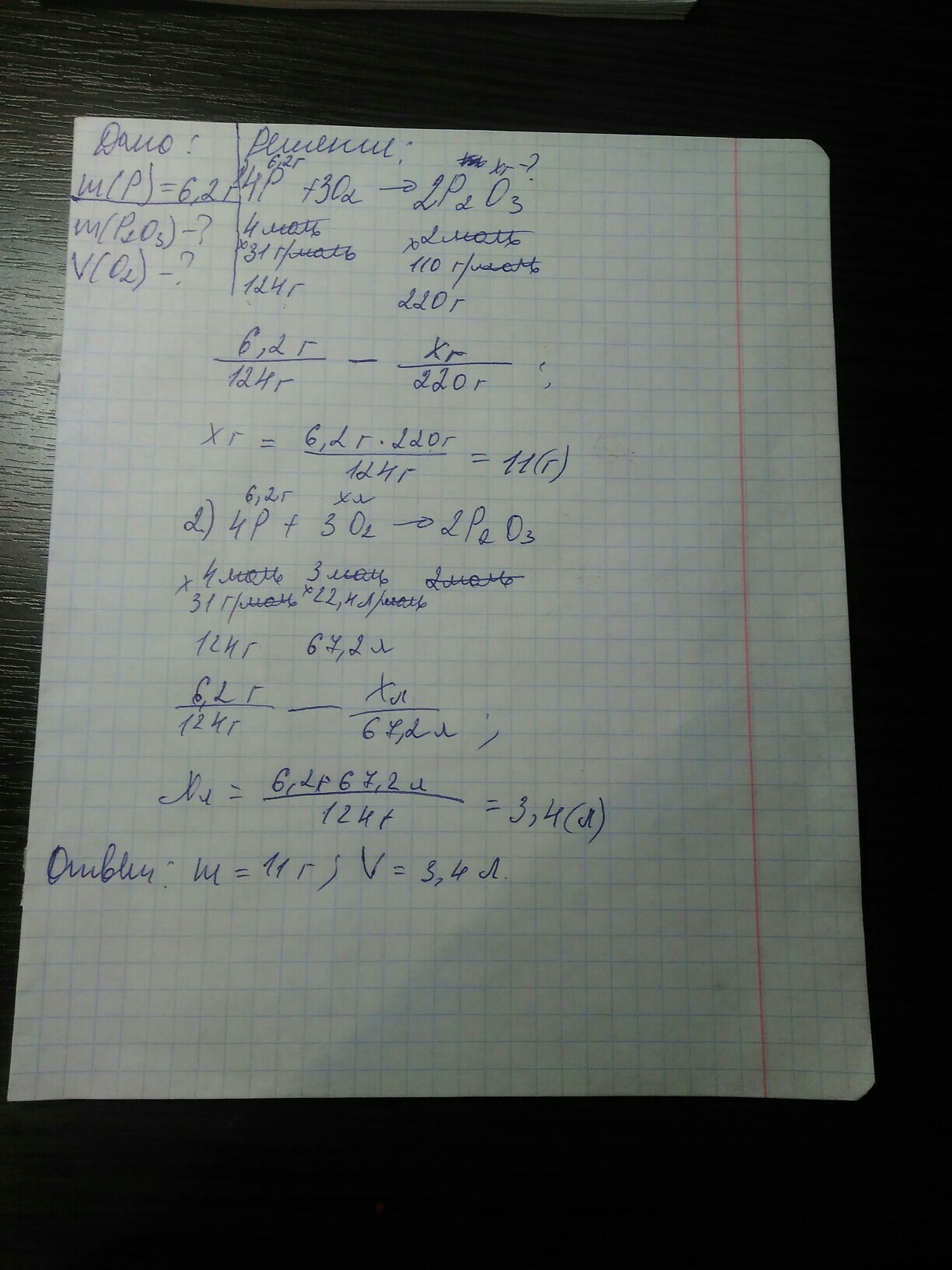 Найдите массу вещества Р2О3, которое образовалось при взаимодействии фосфора массой 6,2 г с кислородом. Определите объем кислорода (н.у.), вступившего в реакцию