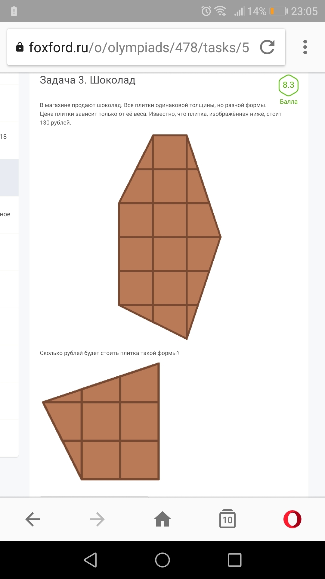 65 рублей, т.к. из нижних квадратов складываются в полные квадраты только 6 кубиков и остаётся половинка. Судя по верхней шоколадке, там получается полных 13 квадратов. Если 130÷13=10(р.) стоимость одного квадратика шоколадки.