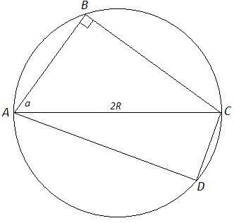 2. В окружность радиуса R вписан четырёхугольник ABCD, диагональ которого AC является диаметром окружности. Найти площадь треугольника ABC, если угол BAC равен α, а угол CAD равен β.