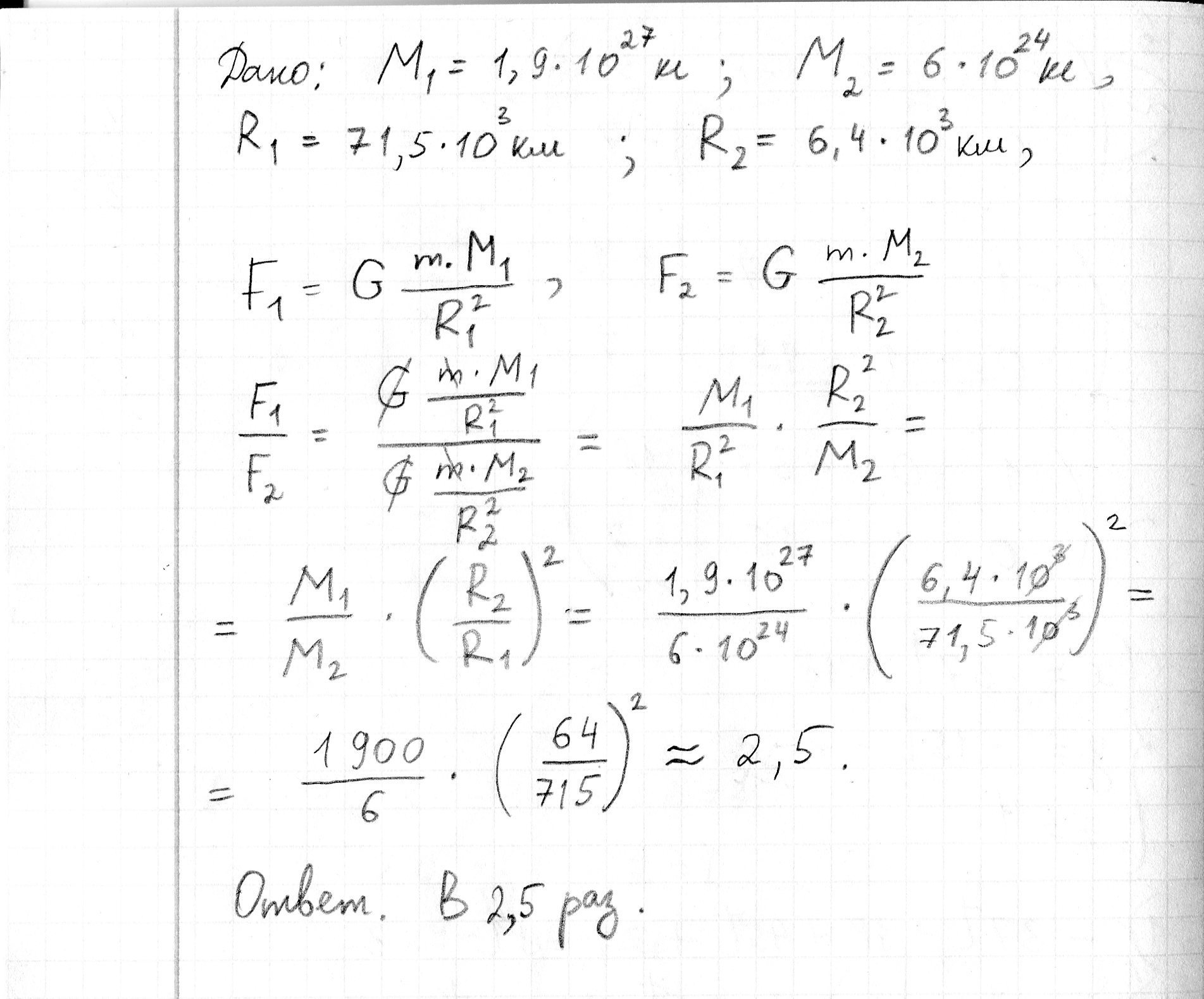 Во сколько раз вес человека на поверхности Юпитера больше его веса на поверхности Земли? Массы планет соответственно равны 1,9 * 10`27 и 6 * 10`24 кг, радиусы планет - 71,5 * 10`3 км и 6,4 * 10`3 км.