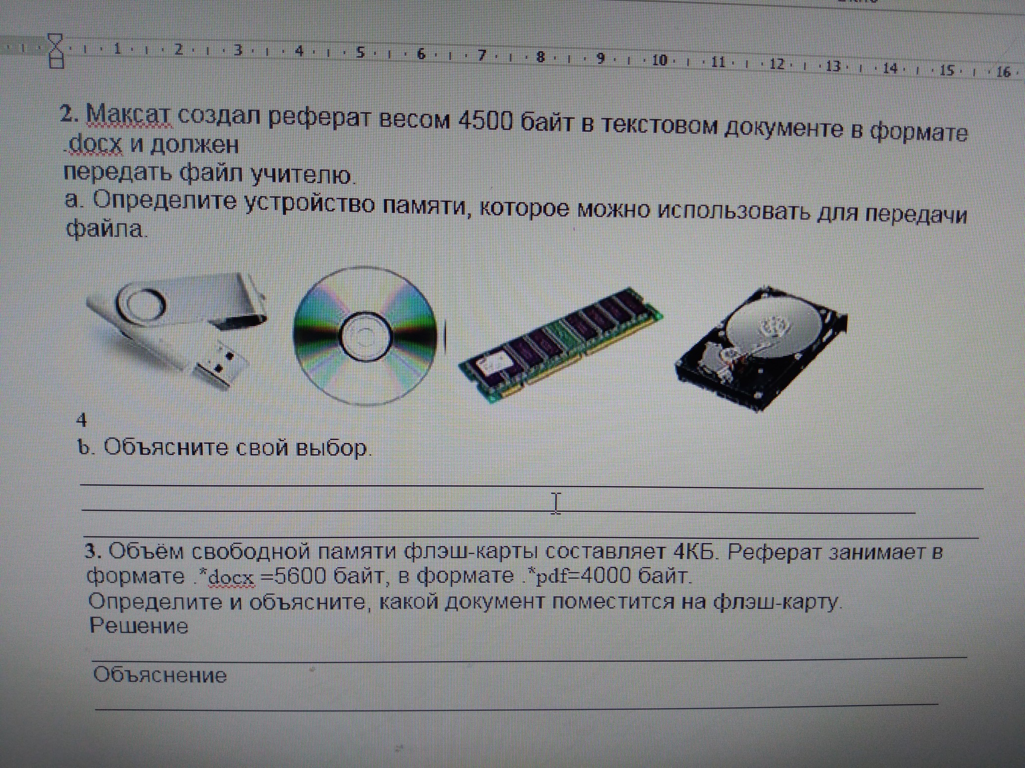 2. Удобнее принсети флеш-накопитель (1). Привод для считывания информации с CD-диска (2) может отсутствовать, оперативная память (3) не предназначена для постоянного хранения информации. Записать на жесткий диск (4) можно, но для переноса информации он не предназначен.