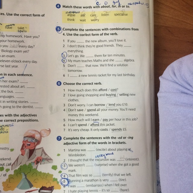 5) 1. listen to 2. argue about 3. wait for 4. soecialises in 5. worry about 6. asked for