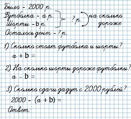 Пусть цена футболки а рублей. цена шорт b рублей. какой смысл имеет выражение a+b; a-b; 2000-(a+b)???
