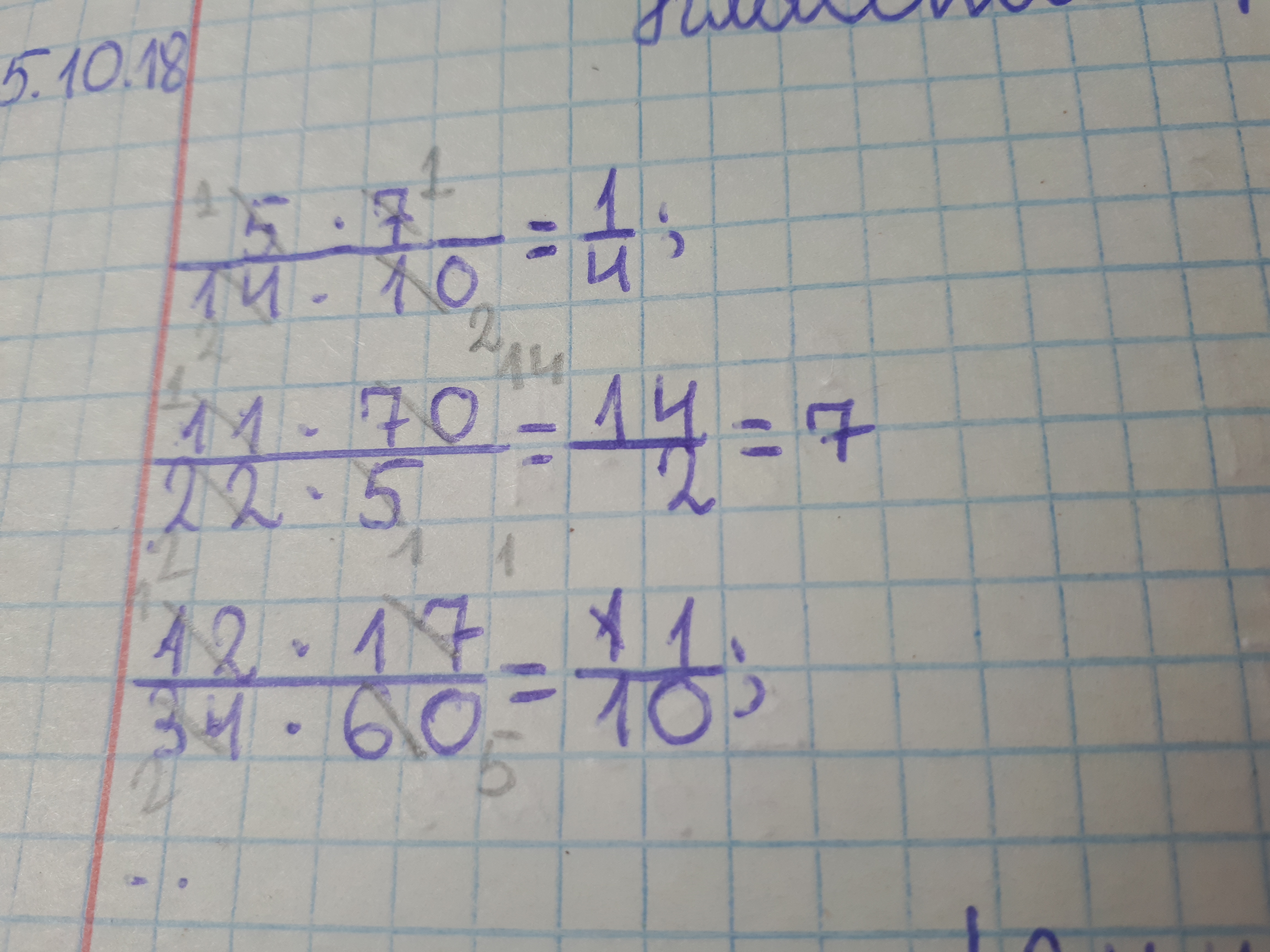 14 и 7 делятся на 7, значит если разделить 14 на 7, получится 2, а если разделить 7 на 7, получится 1. 5 и 10 делятся на 5, значит при делении 5 на 5, остаётся 1, а при делении 10 на 5, получится 2. В числителе у нас остались две единицы, которые нужно переумножить, получим 1, внизу остались две двойки, которые тоже надо умножить друг на друга, получим 4. Ответ: одна четвёртая. Остальные примеры решаются точно так же