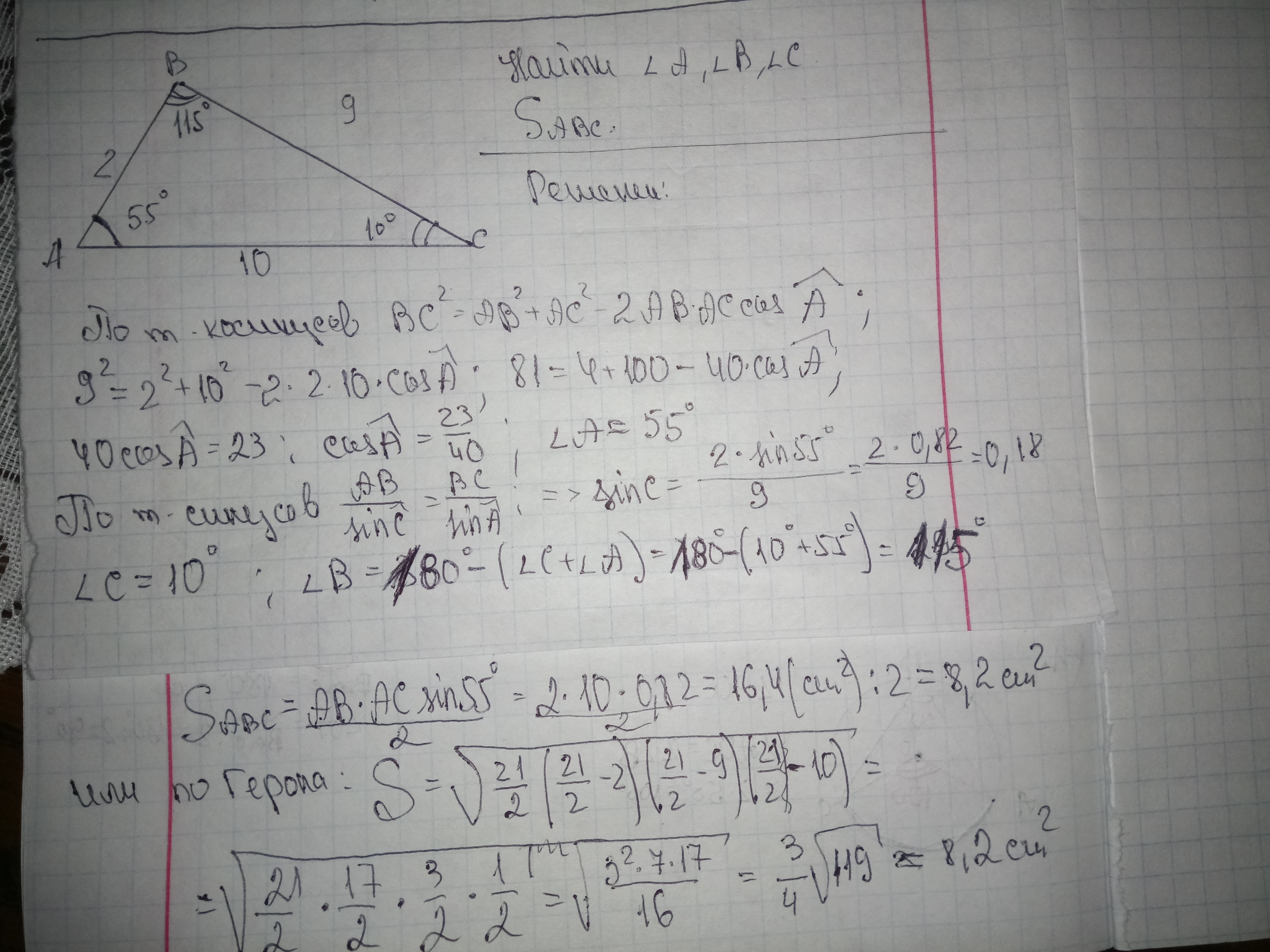 Решение задания приложено. Найдены углы и площадь. Пдощадь два способа.