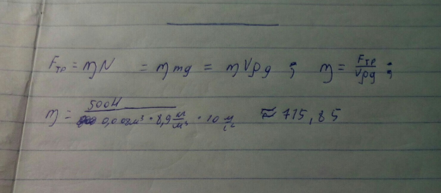 Медный куб со стороной 20 см равномерно тянут по горизонтальному дну аквариума с водой. Сила тяги составляет 500Н. Определите коэффициент трения между кубом и поверхностью аквариума. Силой сопротивления воды пренебрегите.