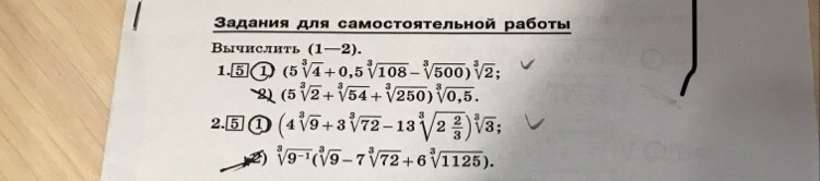 1); ; (5sqrt[3]{4}+0,5sqrt[3]{108}-sqrt[3]{500})cdot sqrt[3]{2}=\\=5sqrt[3]{4cdot 2}+0,5sqrt[3]{27cdot 4cdot 2}-sqrt[3]{500cdot 2}=\\=5cdot 2+0,5cdot 3cdot 2-10=10+3-10=3