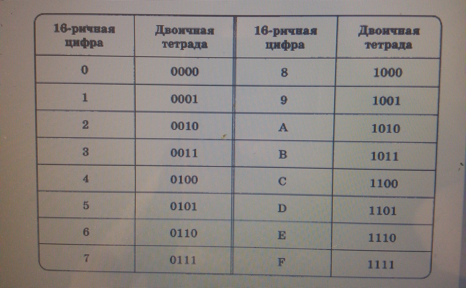каждой шестнадцатеричной цифре поставлена в соответствие цепочка из четырех 0 и 1 (двоичная тетрадь)
