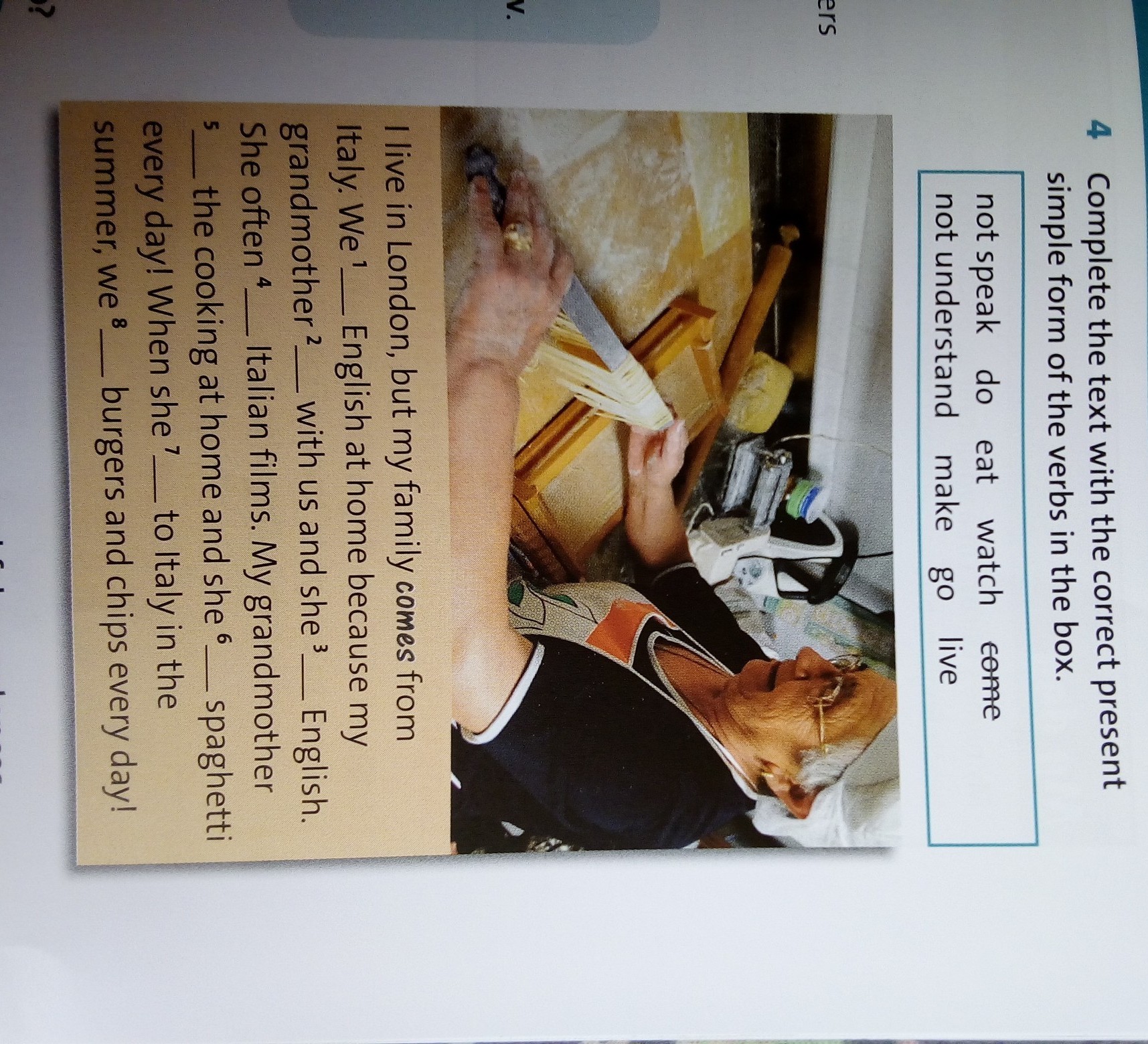 1. don't speak 2. lives 3. doesn't understand 4. Watches 5. Does 6. Makes 7. Goes 8. Eat