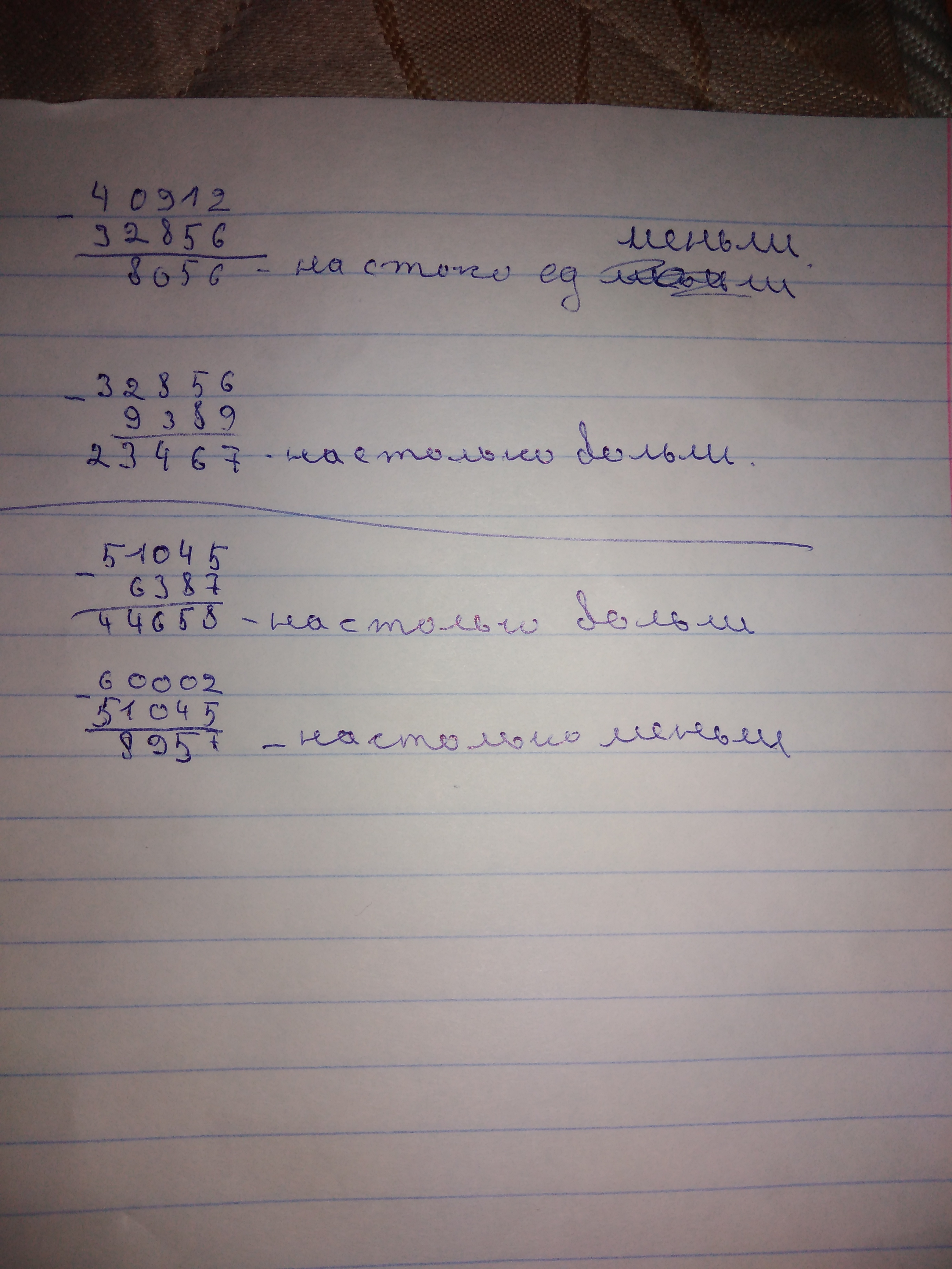 1)на сколько единиц число32856 меньше числа 40912 и больше числа 9389?2)на сколько число 51045больше числа 6387и меньше числа 60002