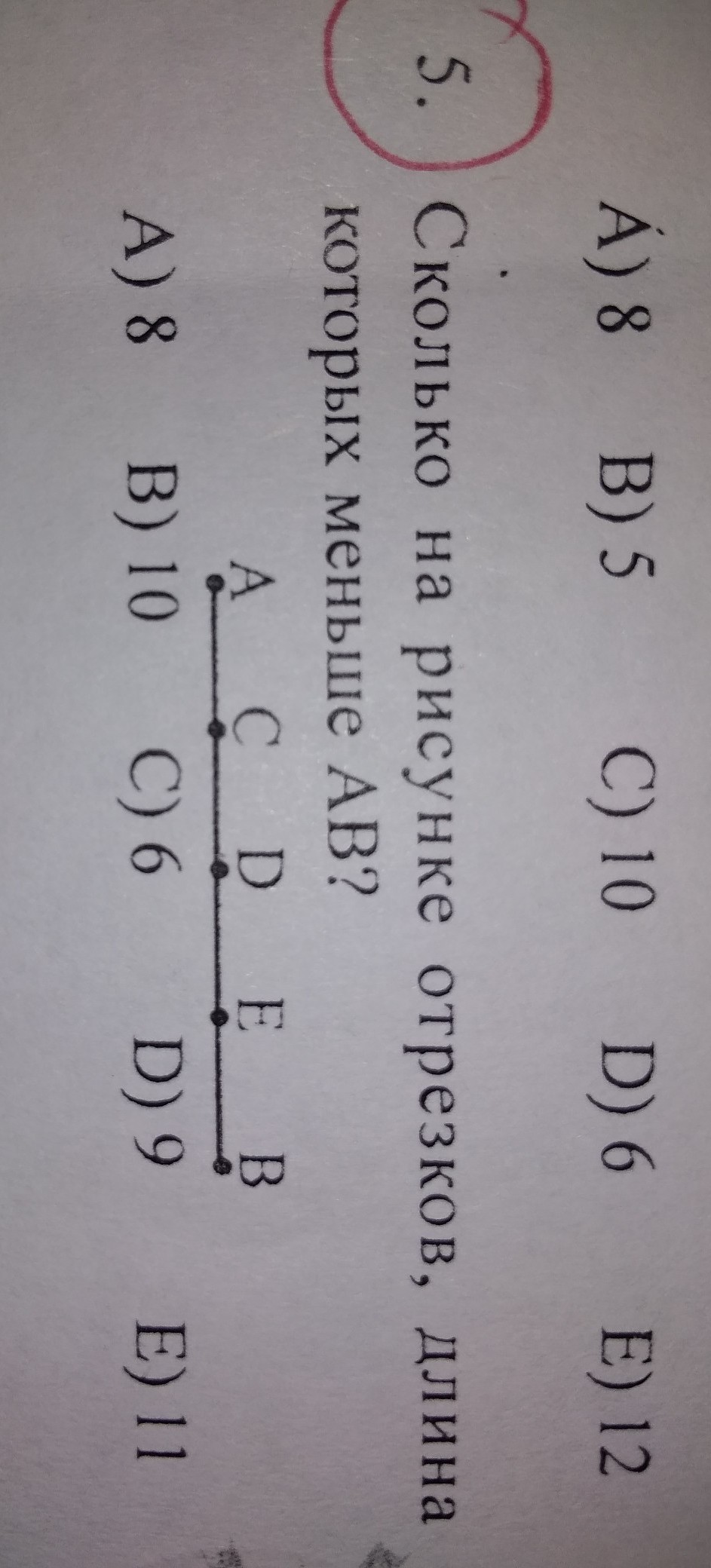 АС, CD, DE, EB, AD, DB, CE, CB, AE - 9 отрезков.