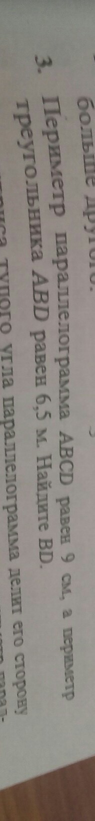 значит AB+AD=BC+CD 9 : 2 =4,5 см AB+AD=4.5 см значит BD=6,5-4,5=2 см