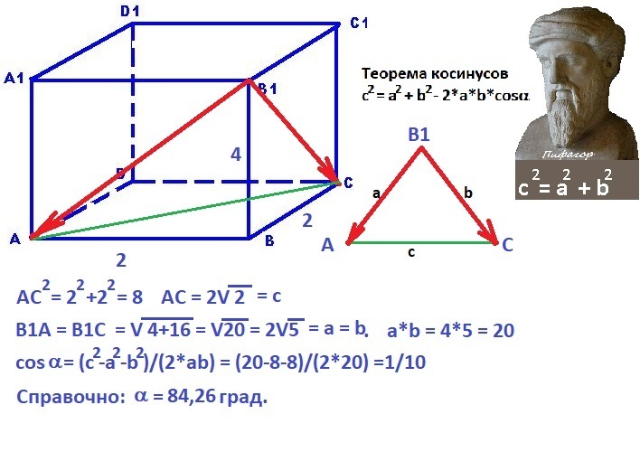 котором А A1=4, а АВ=ВС=2. Вычислите косинус угла