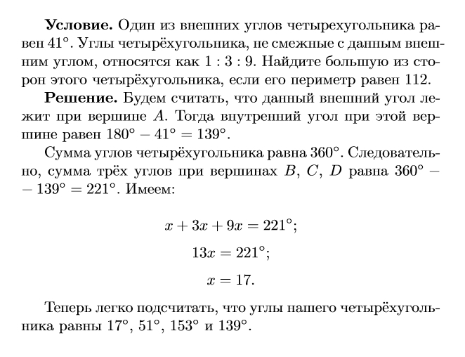 Подскажите:333 Один из внешних углов четырехугольника равен 41°. Углы четырехугольника не смежные с данным внешним углом относятся как 1 :3 :9