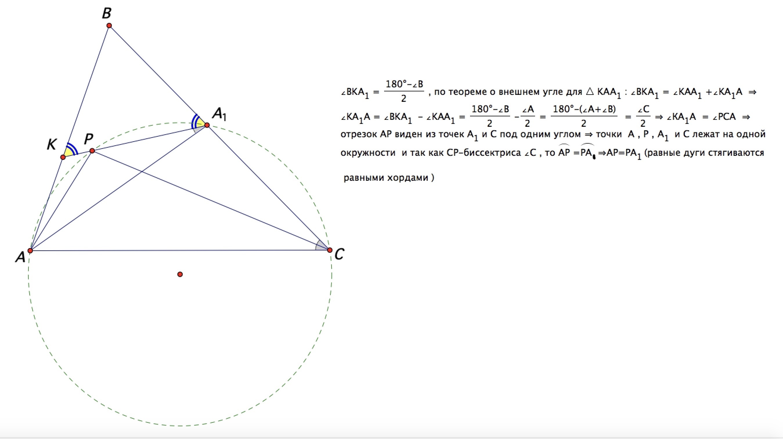 1.В треугольнике ABC проведена биссектриса AA1. На стороне AB выбрана такая точка K, что BK=BA1. Биссектриса угла C пересекает отрезок KA1 в точке P. Докажите, что PA=PA1