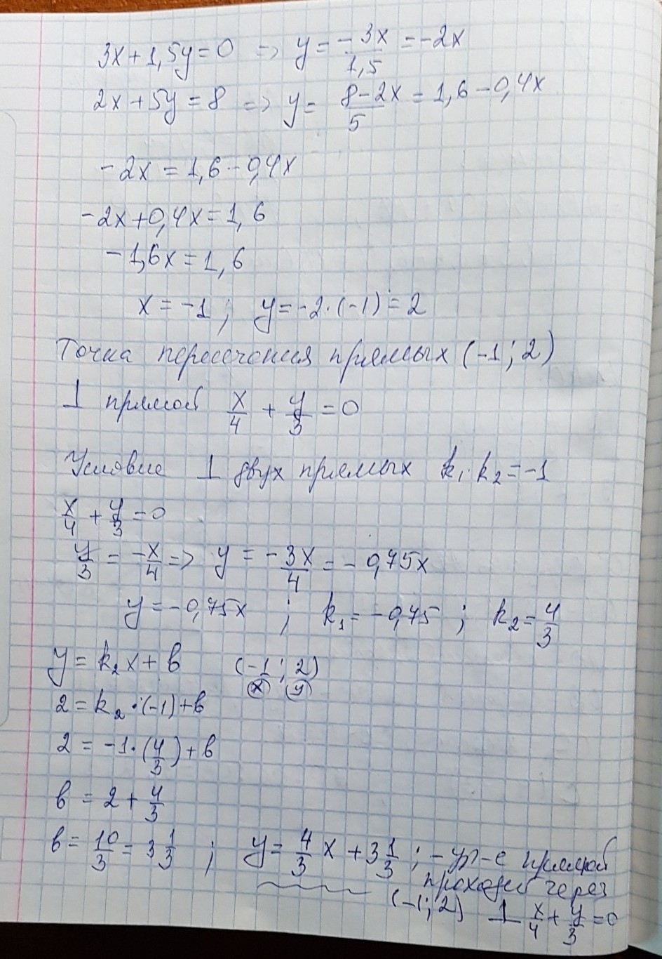 написать уравнение прямой проходящей через точку пересечения прямых 3х+1,5у=0 и 2х+5у=8 перепендикулярно прямой х/4+у/3=0 сделать чертеж