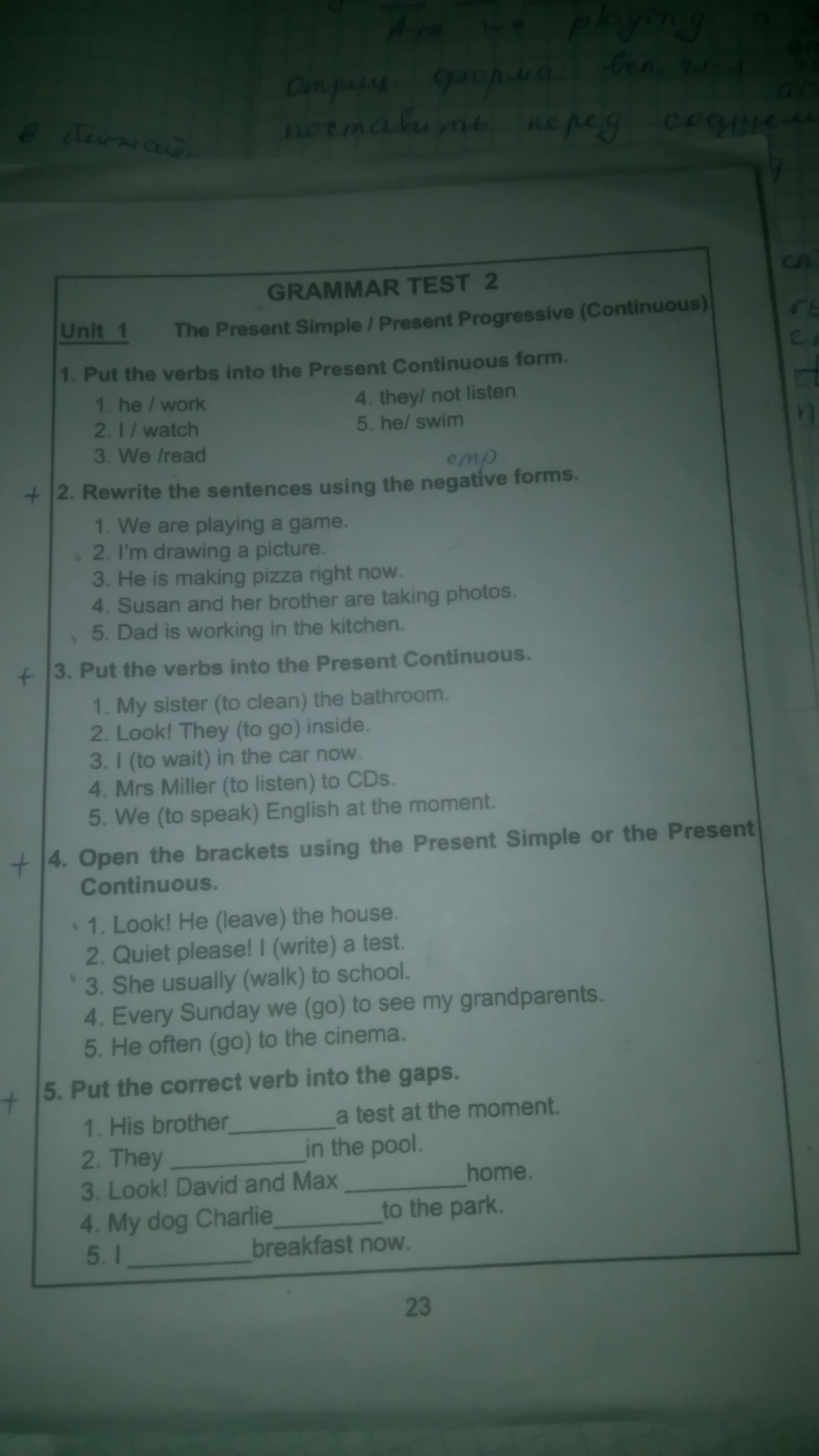 2.1 we aren’t playing a game 2. I’m not drawing a picture 3. He isn’t making pizza right now 4. Susan and her brother aren’t taking photos 5. Dad isn’t working in the kitchen