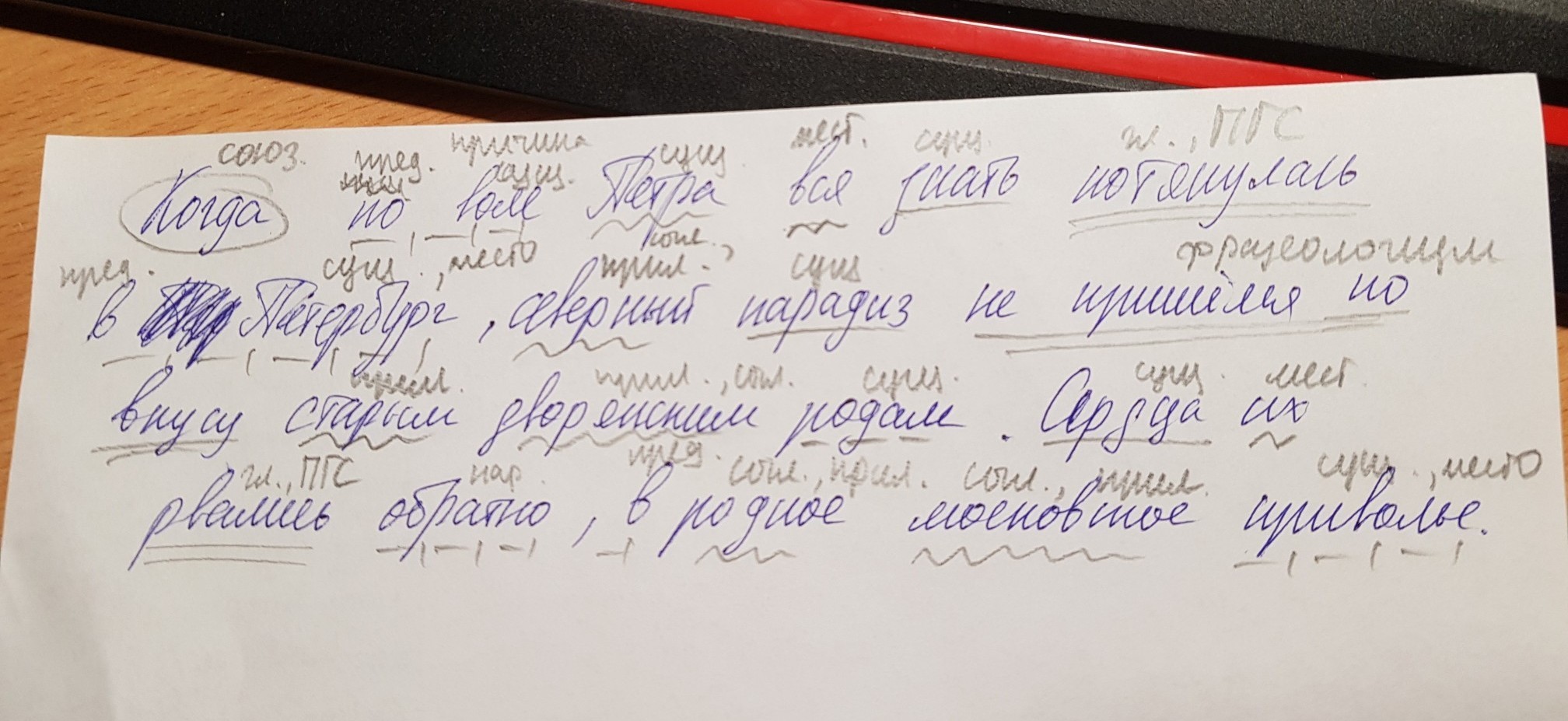 подлежащее одна черта,сказуемое две черты,дополнение пунктир,определение волнистая,обстоятельство пунктир с точкой.