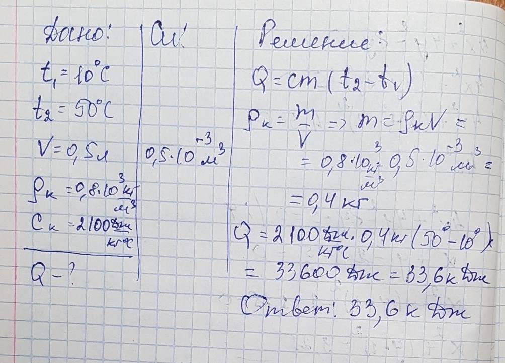 При работе примуса температура керосина в нём повысилась от 10 градусов до 50 градусов. Определите какое количество теплоты пошло на нагревание 0,5 л. керосина налитого в примус