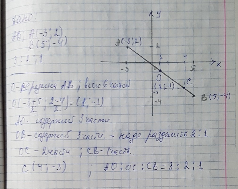 Дан отрезок АВ А(-3;3) В(5;-4). Разделить этот отрезок ( считая от А к В) на частит 3:2:1. Найти координаты точек деления. Сделать чертеж