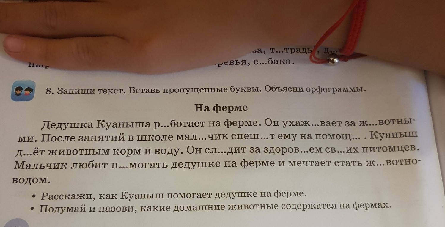Надо буквы ставить?если да то работает,ухаживает,животными,мальчик,спешит,помощи,даёт,следит,здоровьем,своих,помогать,животноводом.