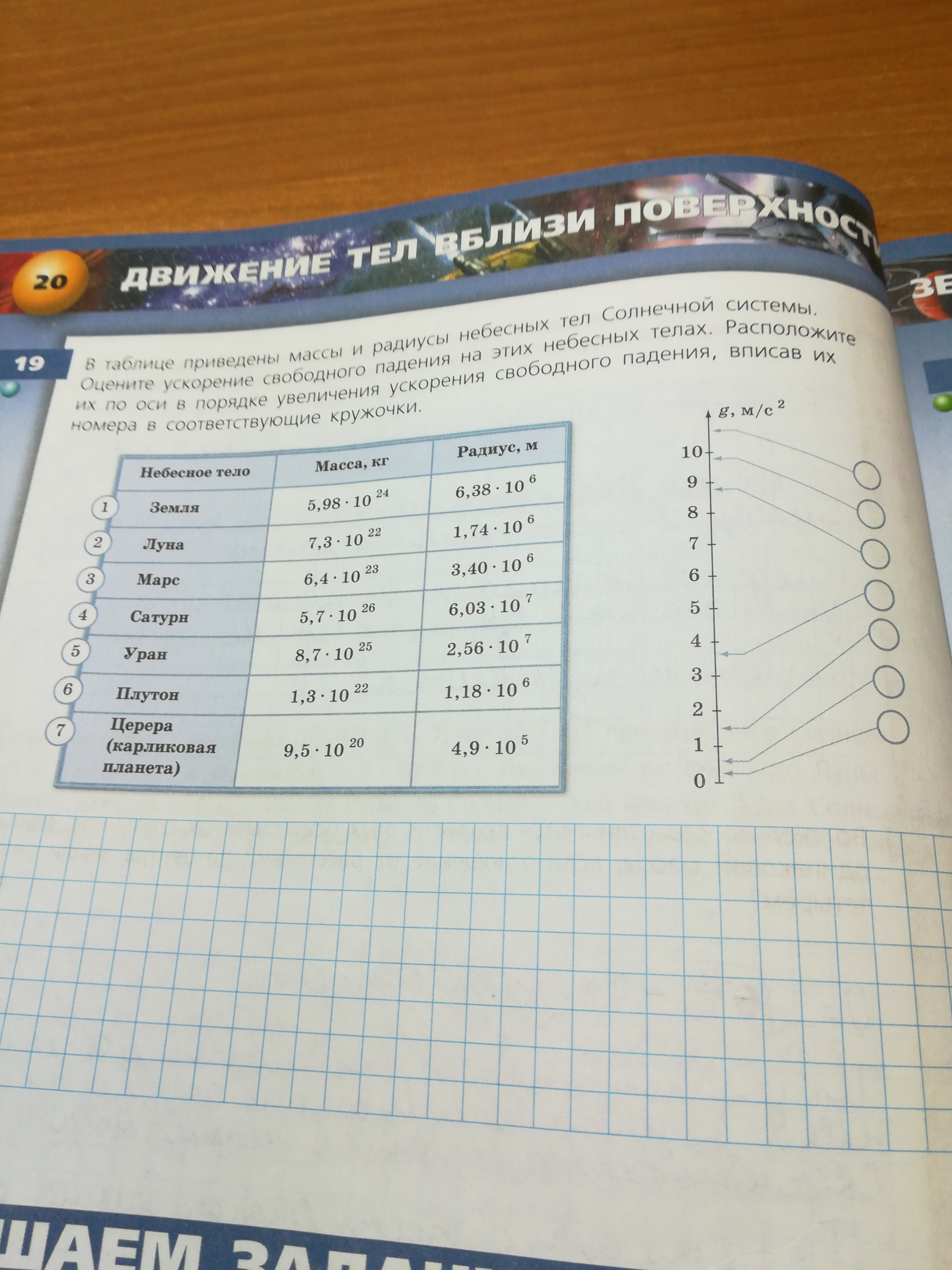 В таблице приведены массы и радиусы небесных тел Солнечной системы. Оцените ускорение свободного падения на этих небесных телах. Расположите их по оси в порядке увеличения ускорения свободного падения, вписав их номера в соответствующие кружочки.