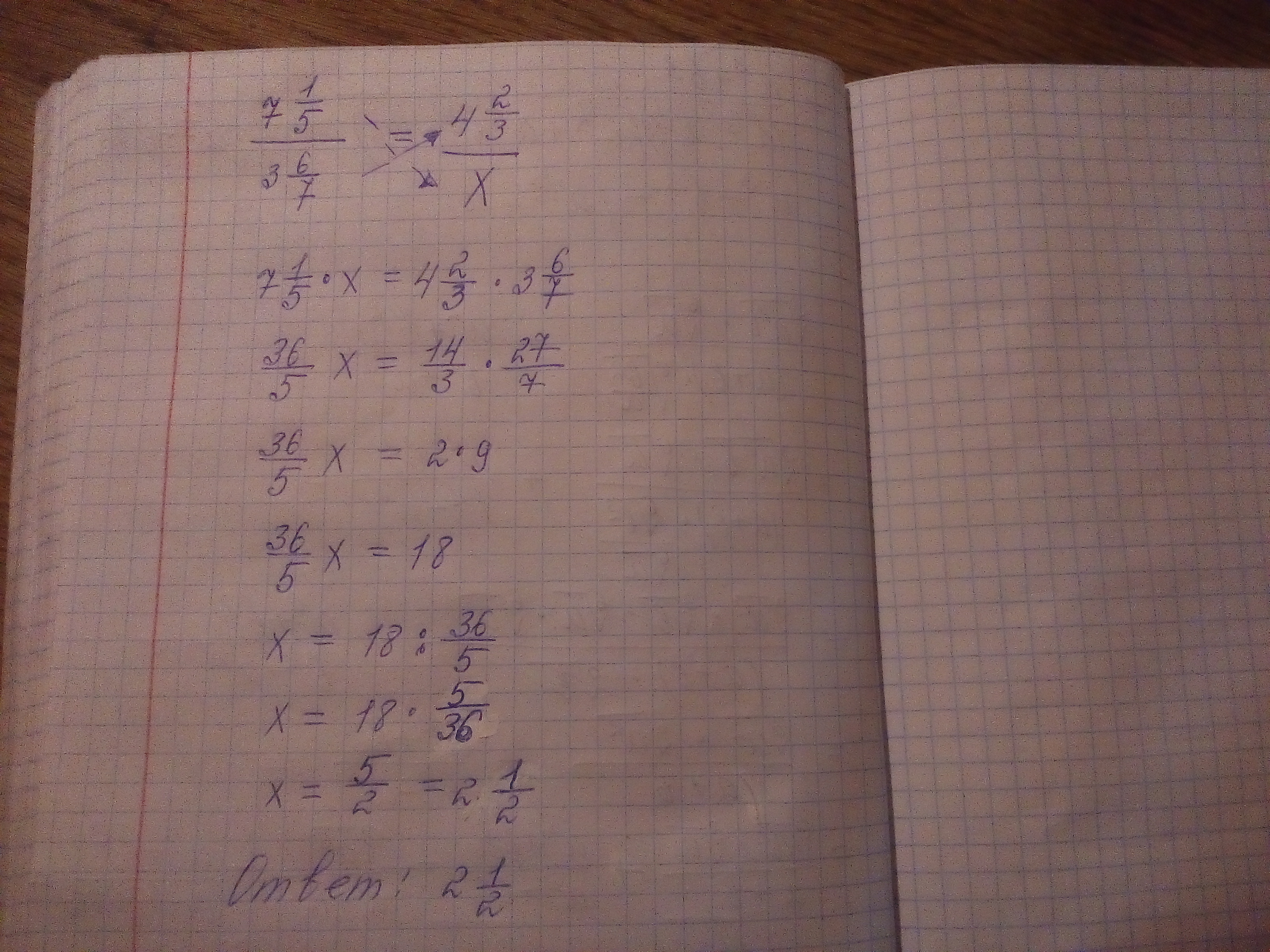 Сначала нужно первую дробь разделить(7целых 1/5 на 3целых 6/7)=28/15
