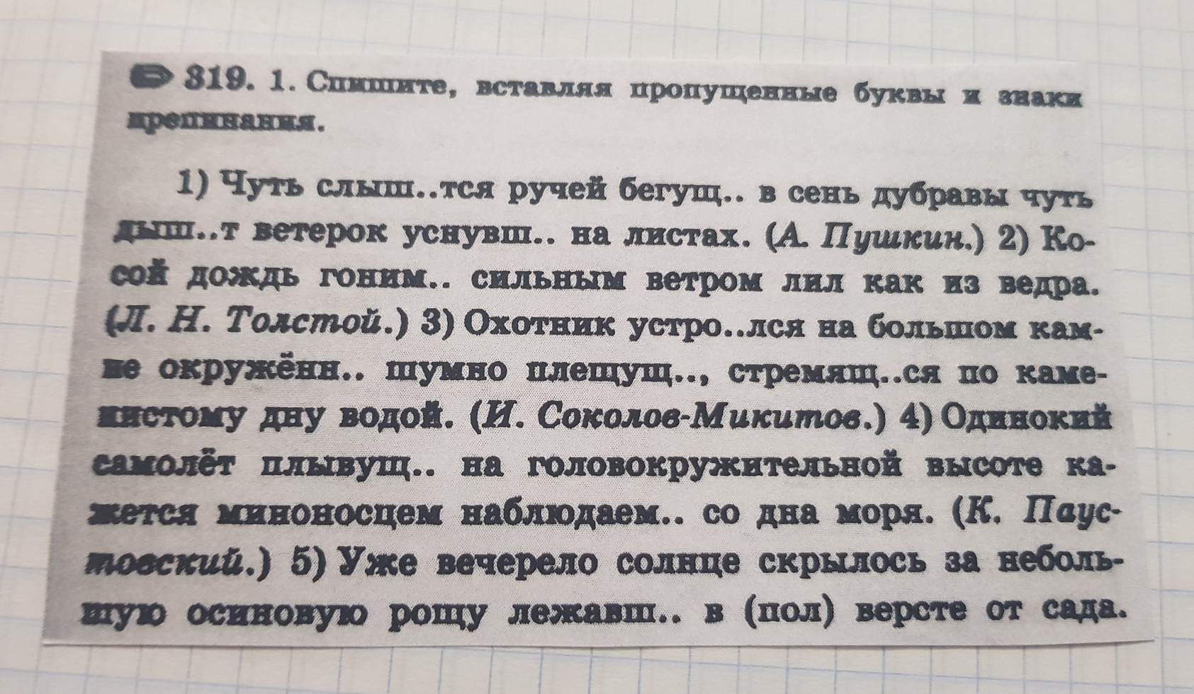 1) Чуть слышится ручей, бегущий в сень дубравы, чуть дышит ветерок, уснувший на листах. 2) Косой дождь, гонимый сильным ветром, лил, как из ведра. 3) Охотник устроился на большом камне, окруженном шумно плещущей, стремящейся по каменистому дну водой. 4)Одинокий самолет, плывущий на головокружительной высоте, кажется миноносцем, наблюдаемым со дна моря. 5) Уже вечерело, солнце скрылось за небольшую осиновую рощу, лежавшей в полуверсте от сада.