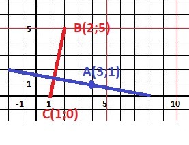 Записати рівняння прямої, яка проходить через точку А(3,1) перпендикулярно до прямої ВС, якщо В(2,5), С(1,0)
