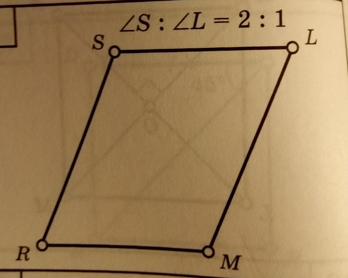 Посчитал. У нас сумма углов при одной стороне равна 180. У нас есть их отношение. Я тебе нашёл величины обоих углов при одной стороне. При второй стороне аналогично