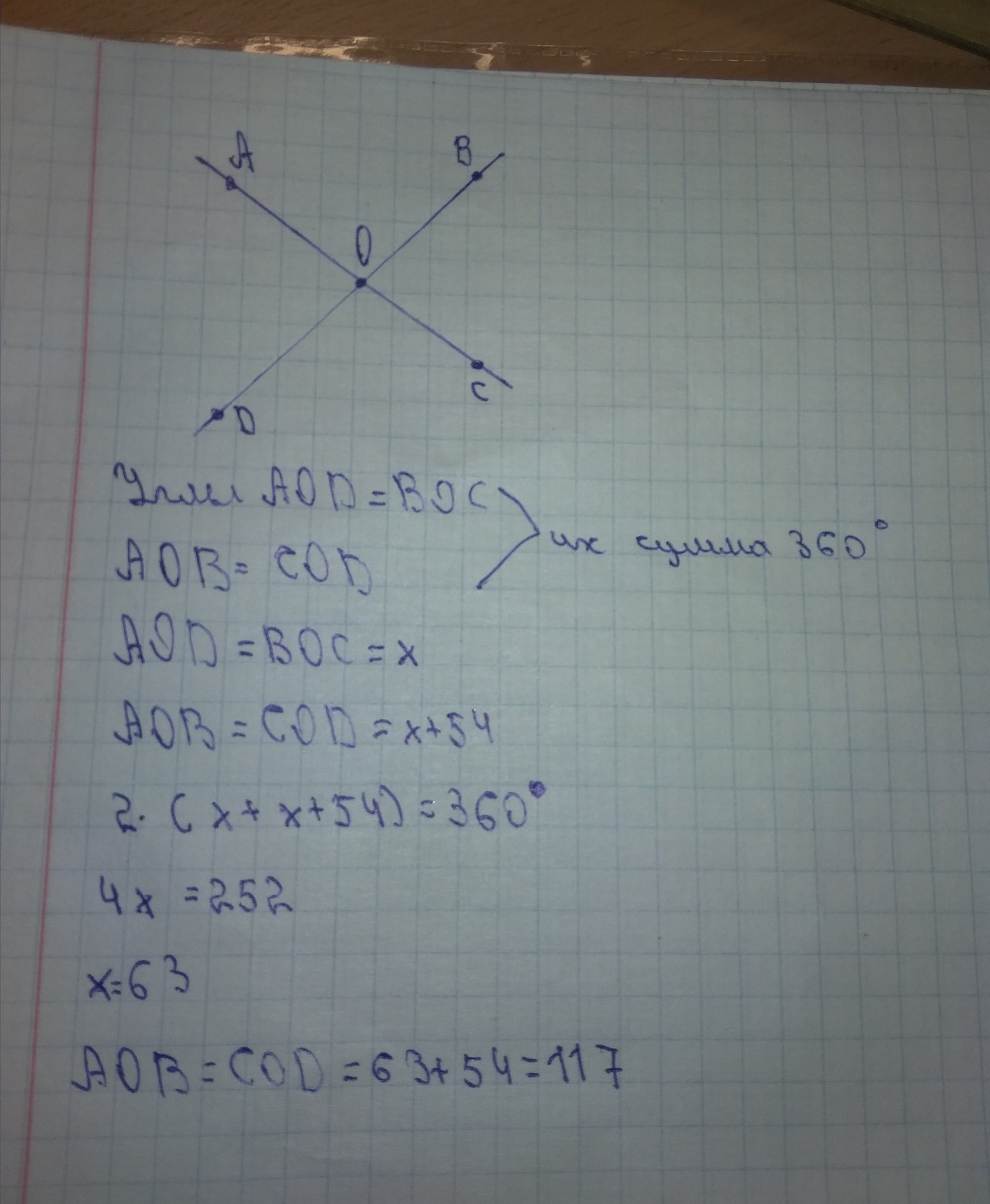 геометрия седьмой класс разность двух углов образовавшихся при пересечении двух прямых равна 54 градуса Найдите каждый из углов