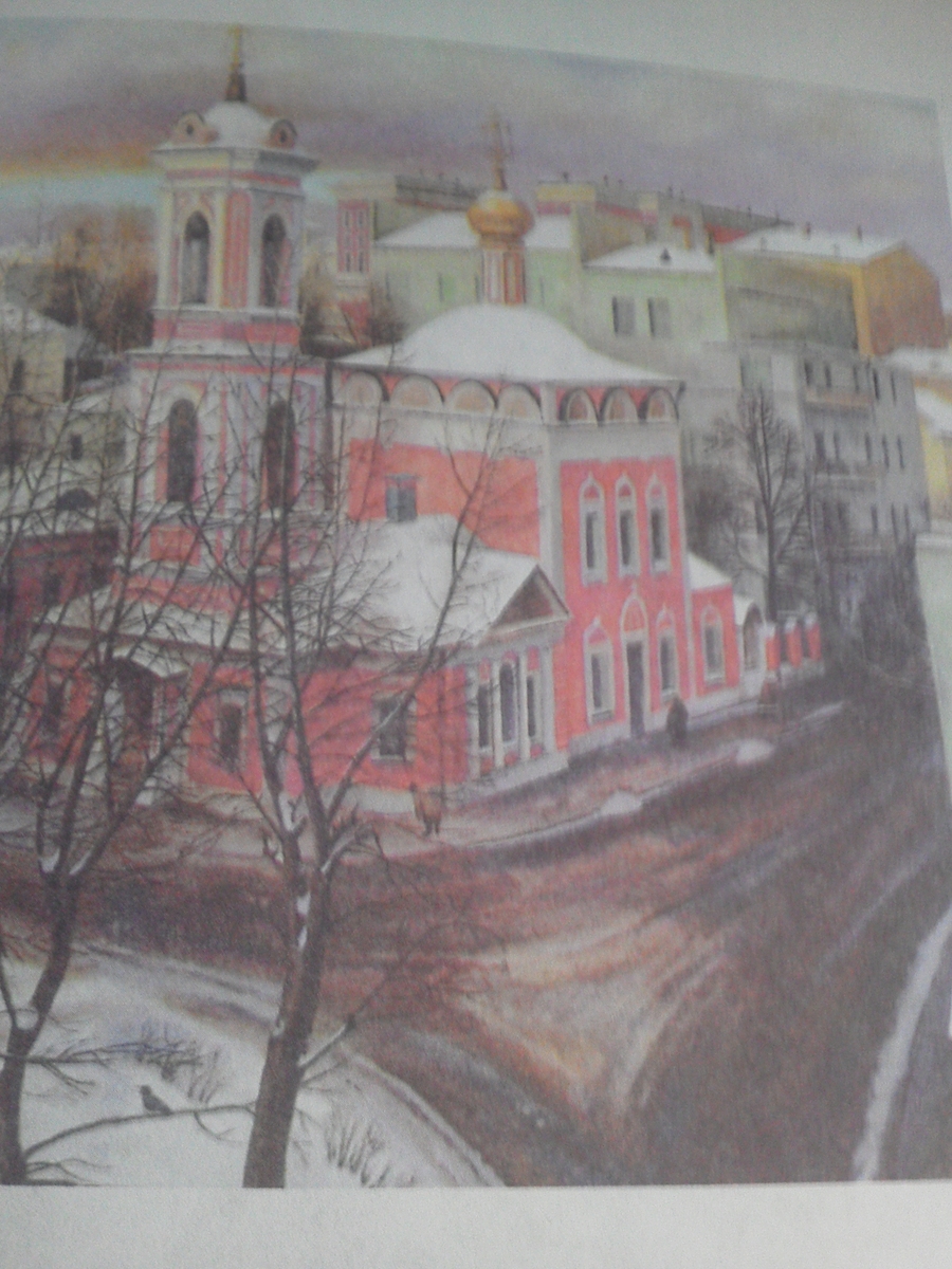 Татьяна Григорьевна Назаренко с детства занималась изобразительным искусством. Ее наставниками были Д. Д. Жилинский, А. М. Грицай, С. Н. Шильников. Она прошла длительный творческий путь и ее работы экспонируются во многих музеях России и за рубежом. В 2002 г. ей присвоили звание заслуженного художника России.Среди множества работ Т.Н. Назаренко есть ряд картин, отличающихся от основного направления творчества художницы. Одна из них - «Церковь Вознесения на улице Неждановой». На своей картине Т. Назаренко изобразила один из Москвовских храмов, возведенный в честь Вознесения Христова.Церковь Вознесения стоит на перекрестке трех дорог. Взгляд художницы направлен на объект изображения под углом с правой стороны. Конечно, художница лишь изобразила прилегающую к церкви территорию так, как она выглядит в действительности: тем не менее известно, что храм никогда не строится на случайном месте. На переднем плане слева мы видим фрагмент территории, на которой растут деревья. На ветвях нет листьев, земля покрыта снегом. Почему-то думается, что художница рисовала церковь Вознесения весной. На тротуаре вокруг церкви и на дорогах нет снега, нет машин и людей. Церковь занимает на картине центральное место — остальные здания, расположенные рядом с ней, выглядят на картине, как хаотичное нагромождение архитектурных фрагментов.Церковь представляет собой двухэтажное здание с четырехскатной крышей, увенчанное небольшой башенкой с золоченым куполом; на переднем плане мы видим одноэтажную пристройку с входом. С противоположной стороны двухэтажного здания имеется такая же пристройка. Еще дальше намечен забор, огораживающий церковный двор. Слева от церкви, за пристройкой, находится колокольня. Мы видим два яруса с высокими арками; очертания креста над крышей колокольни сливаются с небом. Стены церкви окрашены в красный цвет; крыши — белые, покрытые снегом. Это придает церкви нарядный, праздничный вид.Художница акцентирует внимание на церкви Вознесения не только композиционно, поместив ее изображение в центре полотна, но также и цветом. Основные тона в картине — красный, белый и темно-коричневый (дорога); однако художница использовала и другие цвета. Яркие, карнавальные оттенки зеленого, сиреневого, желтого придают картине эффект своеобразного освещения. Трудно определить сразу, какое время дня, однако по дороге, на которой снег уже успел растаять под колесами проехавших машин, можно предположить, что это вторая половина дня. Благодаря тому, что художница выбрала для изображения дорог темную, почти черную краску, создается впечатление, что церковь не стоит на земле, а парит над бездной, олицетворяя сам праздник Вознесения.