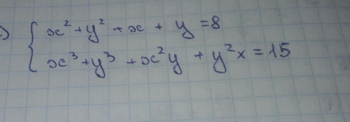 task/29846835 Решить систему { x²+y² +x+y =8 ; x³+y³ + x²y+y²x =15 .