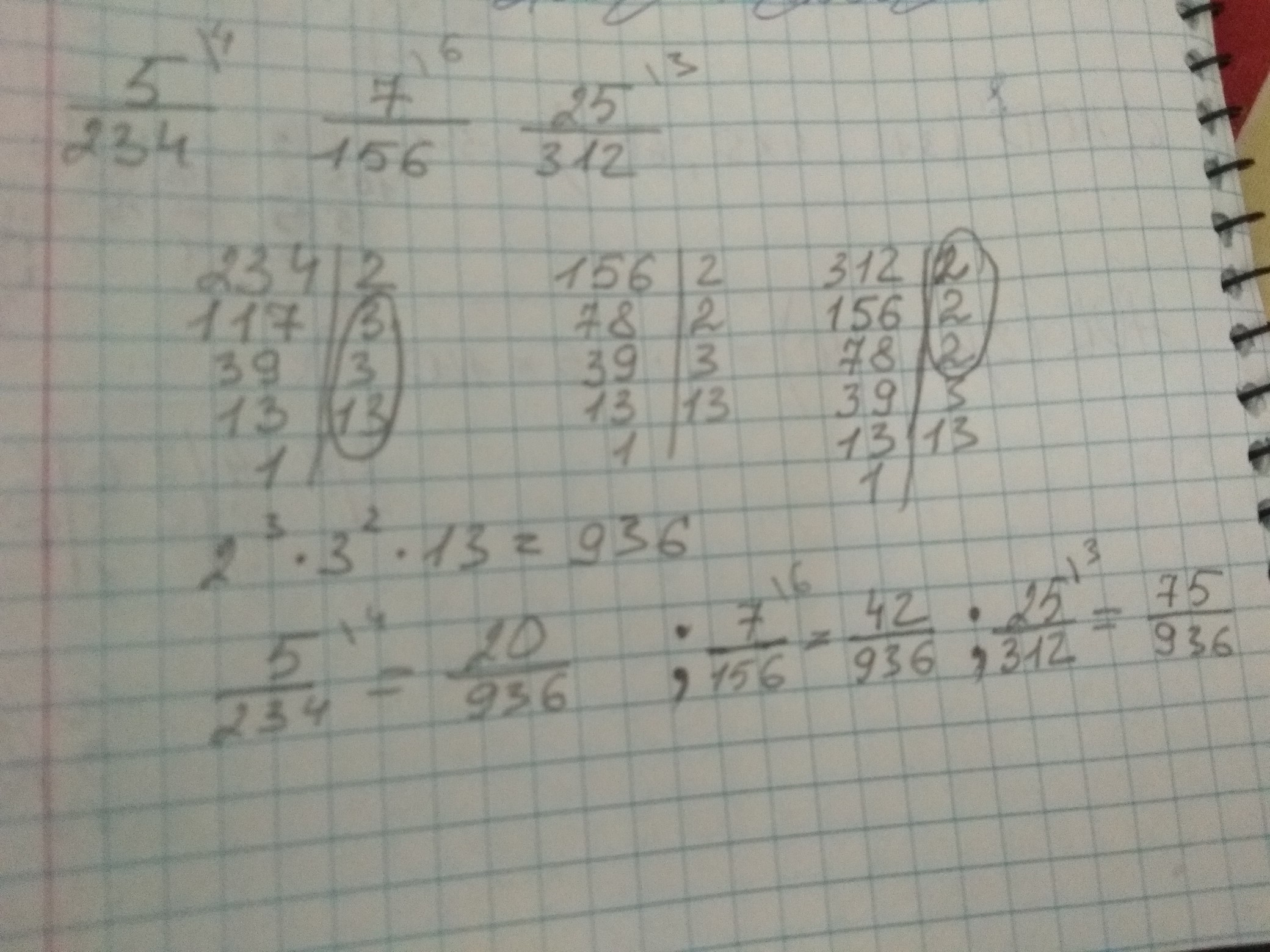 найдите наименьшее общее кратное знаменателей дроби 5/234;7/156и25/312 путем разложения их на простые множители