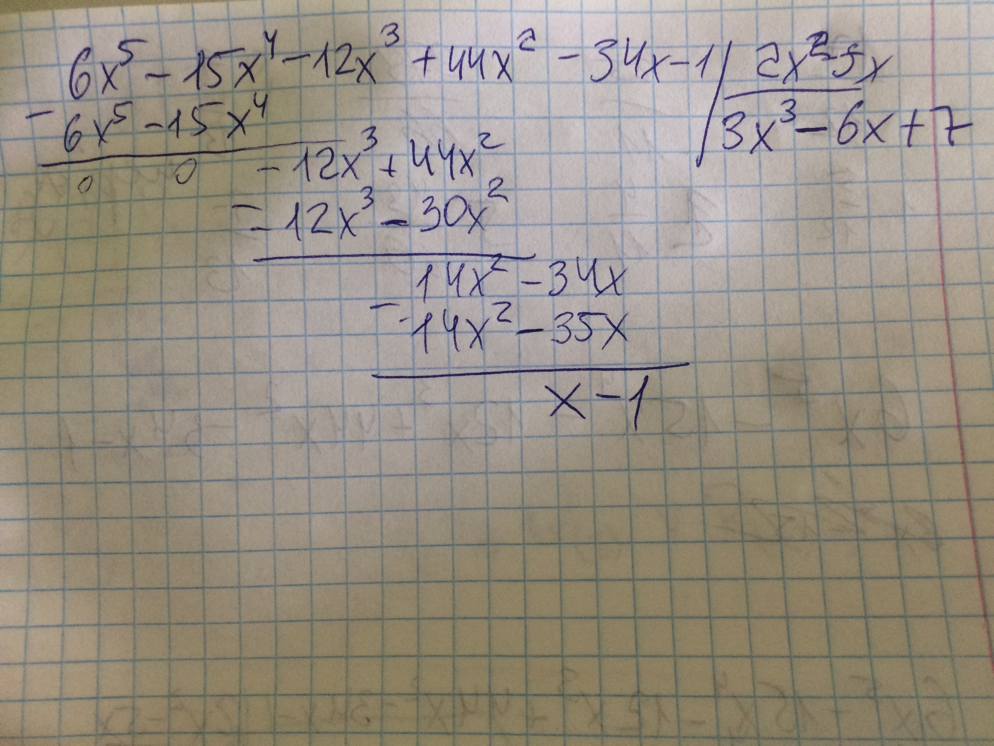 Найти частное и остаток от деления многочлена P(x) на многочлен Q(x), если : 1)P(x)=6x^5-15x^4-12x^3+44x^2-34x-1 Q(x)=2x^2-5x