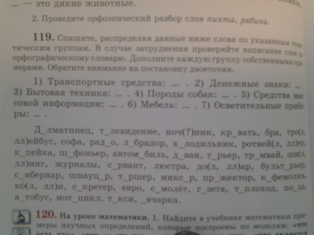 1) автомобиль, автобус, велосипед, троллейбус,трамвай, самолет, теплоход, поезд, мотоцикл. такси; 2) доллар, рубль, копейка, евро; 3) микроволновка, холодильник, миксер, кофемолкарадио, ; 4) долматинец, шпиц, йоркшерский терьер, овчарка,бультерьер, шнауцер, себернар, терьер ; 5) радио, журнал, газета . 6) торшер, кровать , диван. 7) торшер, лампа, люстра))) фух)