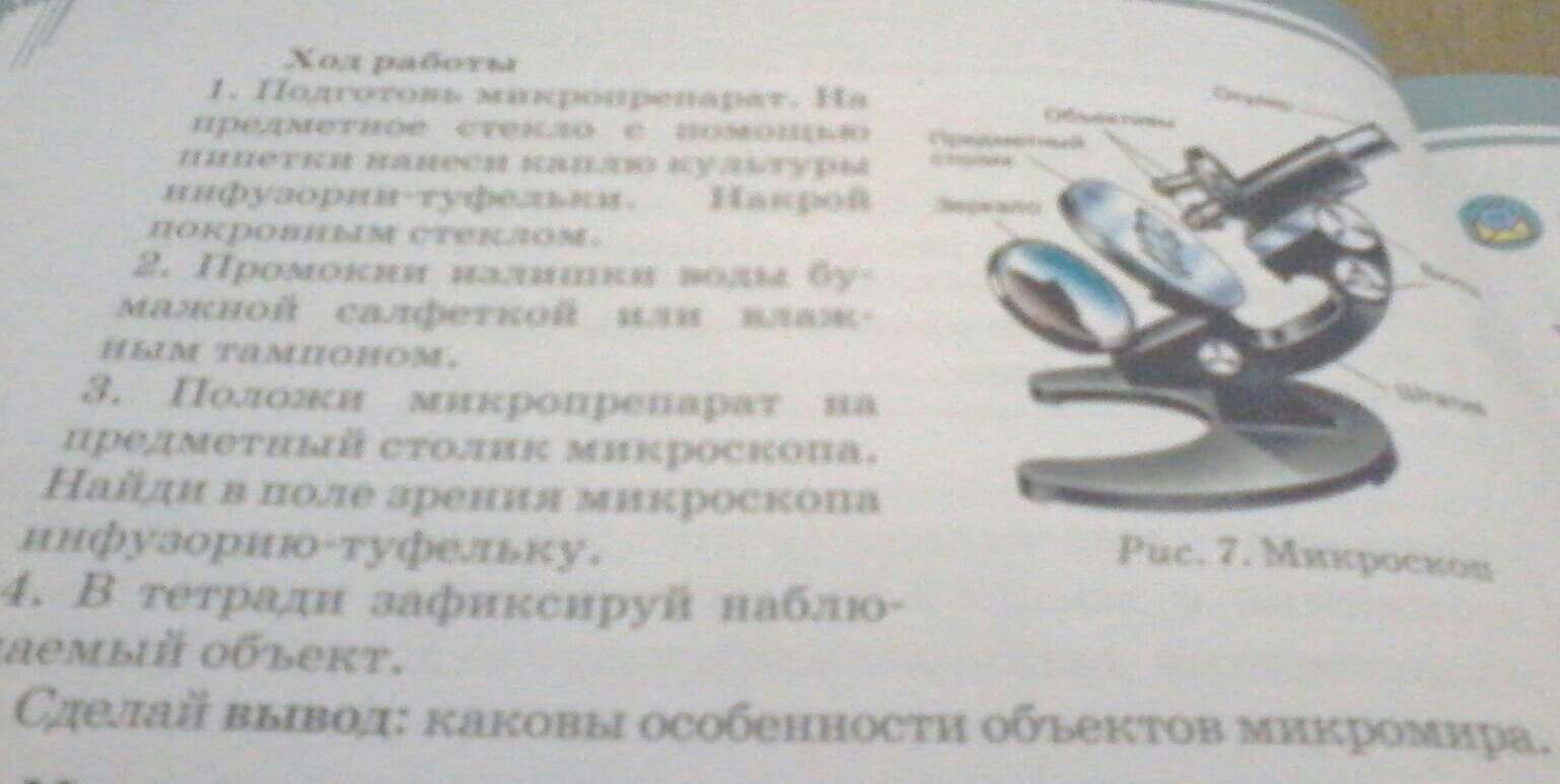 наблюдение за объектом микромира "инфузория-туфелька". вспомни правила пользования световым микроскопом. повтори основные составные части микроскопа.