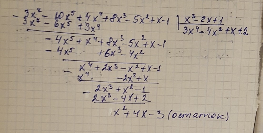 Найти частное и остаток от деления многочлена P(x) на многочлен Q(x), если : P(x)=3x^7-10x^5+4x^4+8x^3-5x^2+x-1 Q(x)=x^3-2x+1