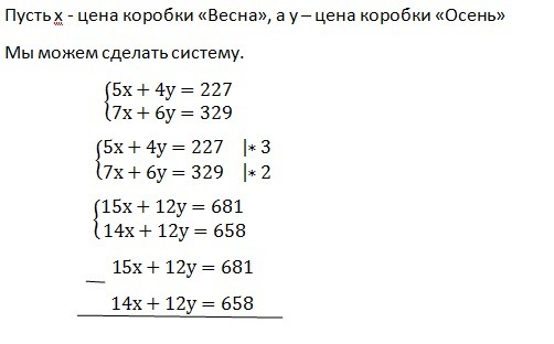 5 кг конфет "Весна" и 4 кг конфет "Осень" стоят вместе 227 рублей, а 7 кг конфет "Весна" и 6 кг конфет "Осень" стоят 329 рублей. Сколько рублей стоят вместе 3 кг конфет "Весна" и 1 кг конфет "Осень"?