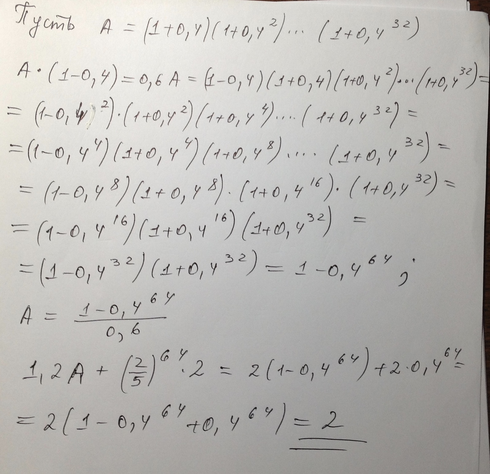 Подскажите пожалуйста, каким методом можно решить быстро и легко этот пример 1,2*(1+0,4)*(1+0,4^2)*(1+0,4^4)*(1+0,4^8)*...*(1+0,4^32)+2*(2,5^(-64))