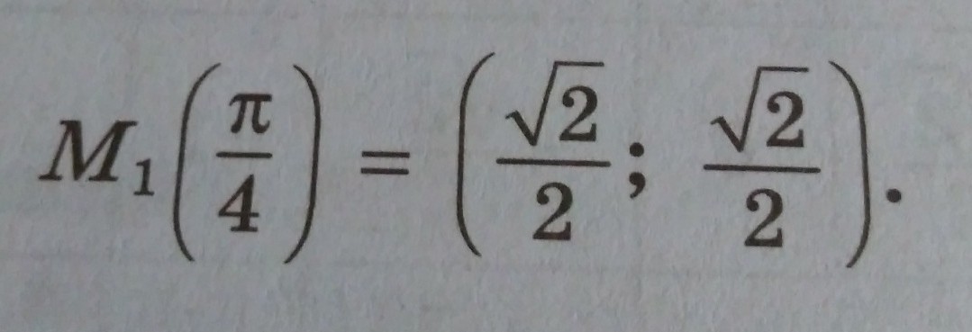 Точка Эм один Пи на 4 находится в координатной плоскости Икс Игрик. На оси Икс(или можно сказать "На оси Абсцисс") в точке корень из двух на два, а на оси Игрик(или можно сказать "На оси Ординат" в точке корень из двух на два.
