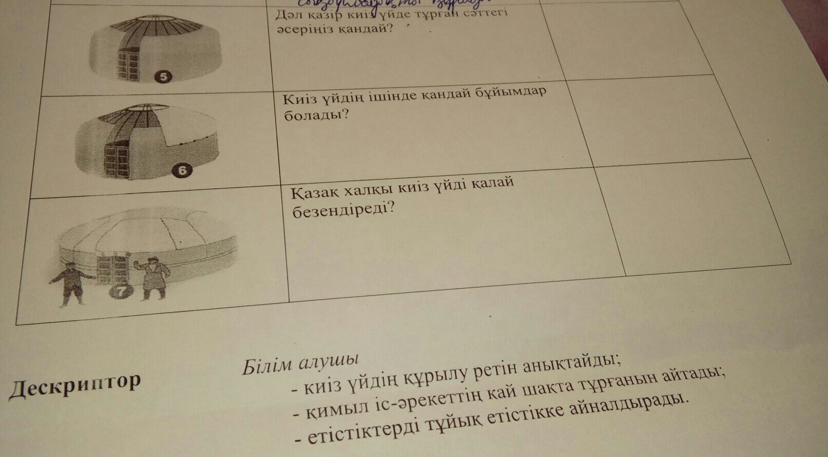 Киіз үйдің ішінде көптеген бұйымдар болады. Мысалы сандық. Бұған көптеген киімдерді,керек заттарың салған. Жəне бұрында киіз үйдің ішіне кілем іліп қойған.