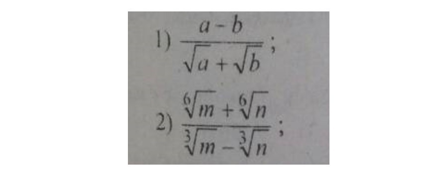 dfrac{sqrt[6]{m}+sqrt[6]{n}}{sqrt[3]{m}-sqrt[3]{n}}=dfrac{sqrt[6]{m}+sqrt[6]{n}}{(sqrt[6]{m}-sqrt[6]{n})(sqrt[6]{m}+sqrt[6]{n})}=dfrac{1}{sqrt[6]{m}-sqrt[6]{n}}