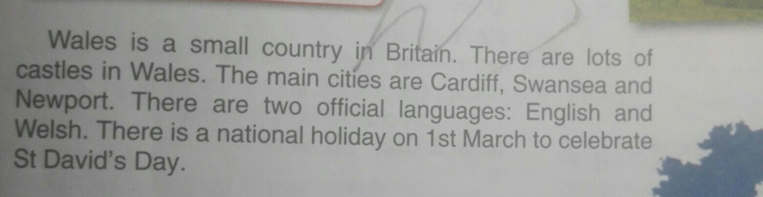 Уэльс - маленькая страна в Британии. В Уэльсе много замков. Основные города - Кардифф, Суонси и Ньюпорт. Есть два официальных языка: английский и валлийский. 1 марта отмечается национальный праздник, чтобы отпраздновать День Святого Давида